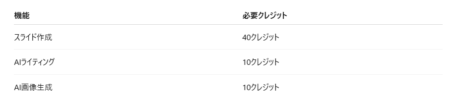 Gammaがどんなツールか体験してみたい方や、たまにしか使わないライトユーザーにぴったりです。初回400クレジットで、プレゼン資料なら約10回作成可能です。