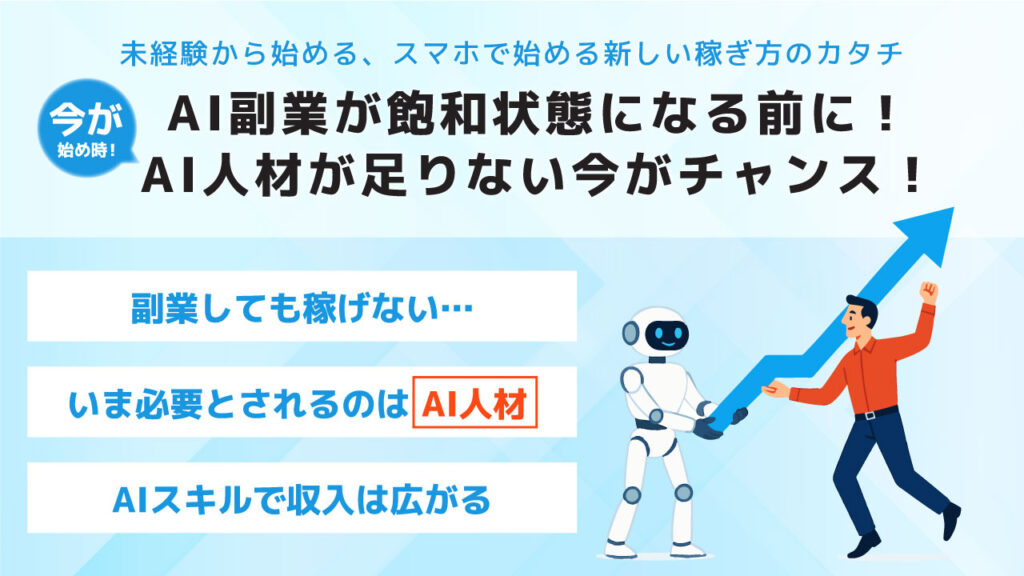 そんな今、スマホひとつで始められ、実践的なスキルが短期間で身につく“AI人材”という選択肢が注目されています。未経験からでも、生成AIを業務に活かす方法を知っているだけで、副業の収入アップや転職成功、独立までの道がひらける時代が来ています。