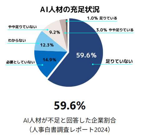 ある調査によれば、国内企業の59.6%が「生成AIを導入したいが、活用できる人材が不足している」と答えています。