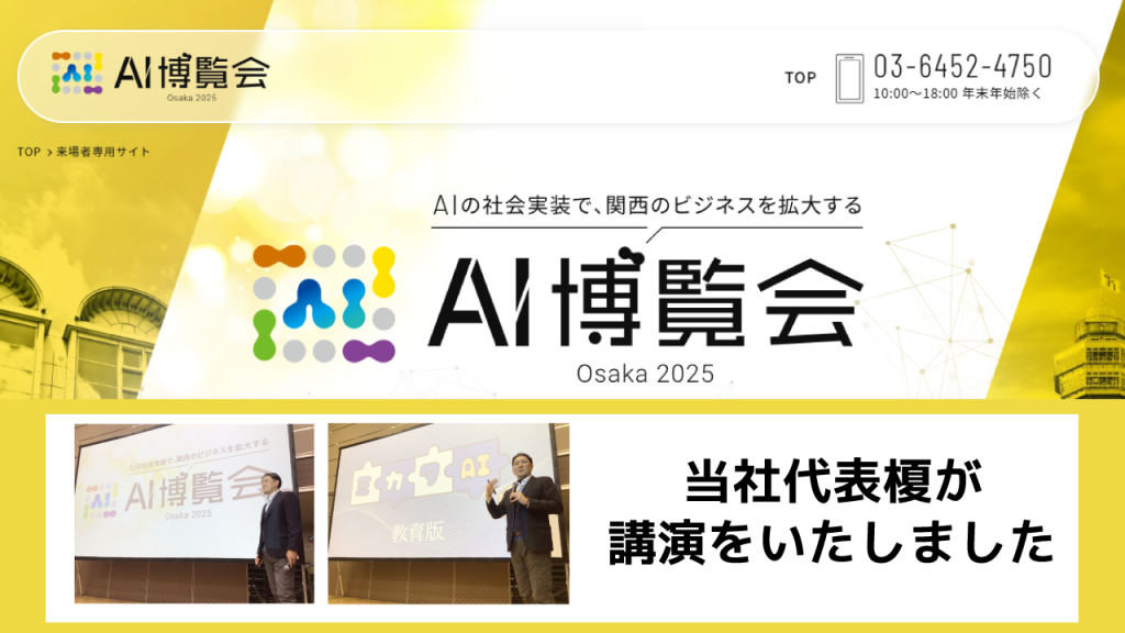 AIの社会実装で、関西のビジネスを拡大する『AI博覧会 Osaka 2025』当社代表榎が講演をいたしました EVENT 2025.01.29 1月22日に大阪で開催されましたAI博覧会Osaka(公式サイトはこちら)にて当社代表榎が講演をいたしました。定員を超える50名超で立ち見が出る盛況ぶりとなりました。ご参加いただきました皆様、誠にありがとうございました。