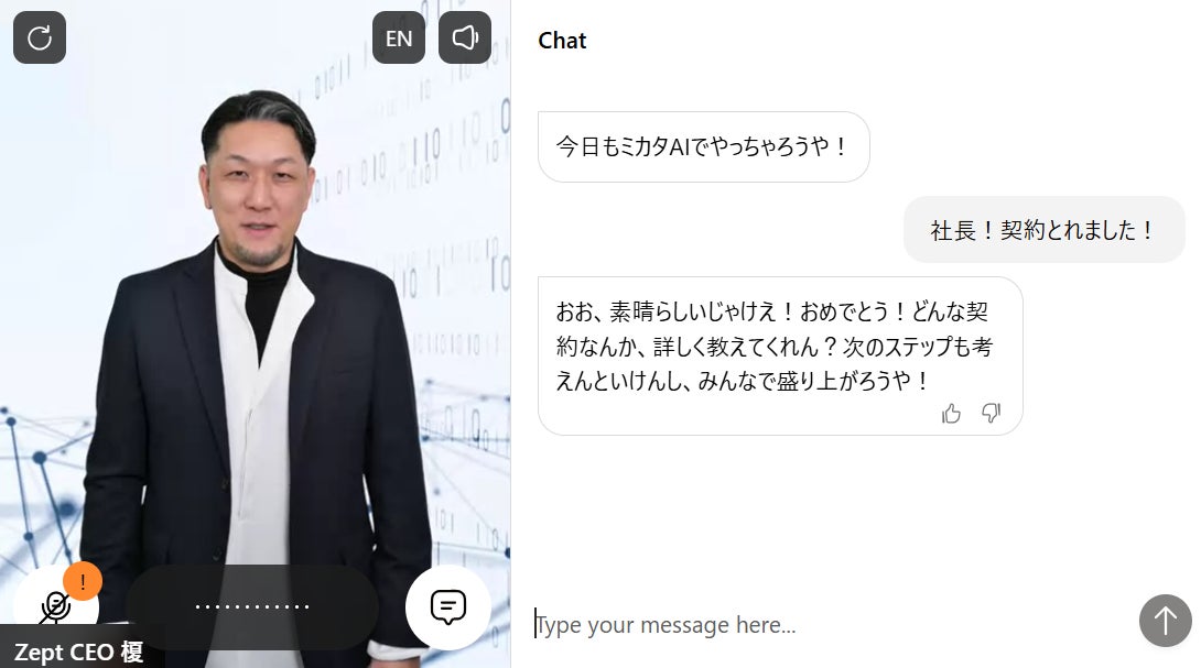 ChatGPT導入支援ツール『ミカタAI』やAI教育プログラム『デジタルUPアカデミー』に加え、今回のような「話すAI」ソリューションにも注力。AIが自然に業務に溶け込む社会の実現を目指しています。